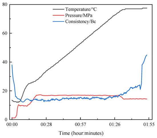 An HTD8040D (Qingdao Haitongda Special Instrument Co., Ltd., Qingdao, China) cementing simulation device is used to monitor the consistency change in the sealing fluid, and the reaction process of cross-linking polymerization between the resin and the curing agent is displayed laterally. It includes control valves, differential pressure threaded sleeves, reaction kettles, consistency meters, and CNC modules. The set temperature and pressure are 75 °C and 15 MPa, respectively.