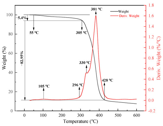 Figure 5 shows the TG and DTG curves of a fully cross-linked TSR-cured body in a nitrogen atmosphere. Two weight loss steps (105–305 °C and 305–428 °C) can be observed for the TSR-cured body. It can be seen in the figure that the thermal decomposition temperature of the TSR-cured body is approximately 300 °C, and the weight loss rate of the material before 300 °C does not exceed 6%. The initial decomposition temperature and maximum decomposition temperature of the TSR-cured body are 305 °C and 428 °C, respectively. Degradation of unreacted curing agents or oligomers and polymer chains occurs at 105 °C and 381 °C, respectively. This shows that they have excellent temperature resistance, and the material will not be damaged under normal working conditions.