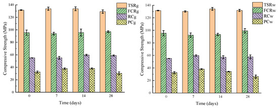 Compare the compressive strength values of samples exposed to gas and water environments with the initial samples, record the data changes, and evaluate the material’s resistance to supercritical carbon dioxide through the changes in compressive strength. The data changes are shown in Figure 6 and Table 2. As can be seen in the graphs, the mechanical properties of TSR and FCR are almost unchanged after corrosion by carbon in the gas and water phase environments, indicating excellent resistance to supercritical carbon dioxide corrosion, and the compressive strengths of the two are much higher than those of the ordinary Portland cement. The compressive strengths of RC and PC first increase and then decrease. The cement stone is carbonized in the early stages of the reaction and CO2 reacts with Ca(OH)2 and C-S-H to form a high-density corrosion product, CaCO3, which fills the pore and crack structure within the cement stone, resulting in an increase in the compressive strength of the cement stone. Later, through leaching and decalcification, the CaCO3 produced continues to react with CO2 and H2O to form soluble Ca(HCO3)2. Ca(HCO3)2 is continuously transported out of the cement stone matrix under the action of water, leaving only amorphous silica gel without cementing ability, resulting in a decrease in the mechanical properties of RC and PC [10,42]. Among them, the loss of strength is more severe in the water environment. Although the compressive strength of RC is not as good as the two types of resin materials, its corrosion resistance and mechanical properties are also better than PC, making it a better choice.