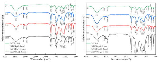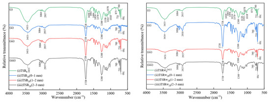Figure 7 and Figure 8 show the FTIR spectra of TSR and FCR samples at different depths after gas phase and water phase corrosion, respectively. For pure resin TSR0, the stretching vibration of the hydroxyl group (-OH) is located at 3455 cm−1. The stretching vibration of the carbon–hydrogen bond (C-H) of saturated hydrocarbons is located at 2937–3084 cm−1, with 3–4 absorption peaks, and the complete vibration of C-H is located at 1454 cm−1 and 1379 cm−1. Because the vibrational energy levels of the C-H bonds in -CH2- and -CH3 are not very different, their absorption peaks overlap to form a mixture, and the peak bands are difficult to distinguish. The absorption spectrum of the ester group is the strongest, at 1728 cm−1, which is the stretching vibration of the carbonyl group (C=O). The ether oxygen bond (C-O-C) in the ester group has two absorption peaks, namely, the symmetric stretching vibration (ʋs) and the asymmetric stretching vibration. The stretching vibration (ʋas) is located at 1266 cm−1, 1156 cm−1, and 1102 cm−1, respectively. The stretching vibration of the unsaturated double bond (CH=CH) is located at a weak absorption peak at 1639 cm−1. The vibration of the benzene ring has two vibrational bands of the conjugated system appearing at 1602 cm−1 and 1494 cm−1, respectively. The resin is a bisphenol A-type vinyl ester resin with a 1,4-disubstituted benzene ring, so it has medium-strong absorption peaks at 875 cm−1 and 731 cm−1. 1078 cm−1 is the stretching vibration peak of the secondary alcohol, and 1018 cm−1 is the stretching vibration peak of the primary alcohol. Values of 700 cm−1 and 760 cm−1 are the out-of-plane bending vibrations of hydrogen on the monosubstituted benzene ring [44,45]. For the filler composite resin FCR0, the infrared vibrational peak of the organic corresponding group of the resin corresponds one to one with that of the pure polyester resin. Among them, the strong absorption peaks in the region of 1081 cm−1, 1117 cm−1, and 1186 cm−1 are the stretching vibrations of oxygen–sulfur bonds. The two strong absorption peaks at 610 cm−1 and 983 cm−1 are bending vibrations of oxygen–sulfur bonds [46].