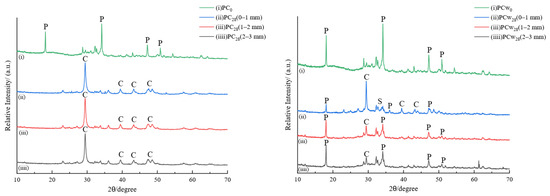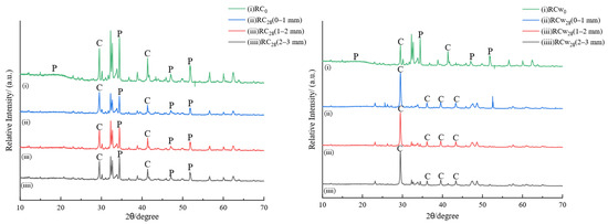 Figure 9 and Figure 10 show the XRD spectra of PC and RC sampled at different depths after gas phase and water phase corrosion, respectively. P represents calcium hydroxide, C represents calcium carbonate, and S represents silica. The main crystalline phase of uncorroded cement PC0 is Ca(OH)2, and the corresponding crystallographic diffraction angles are 18.00°, 34.19°, 47.10°, and 50.80°. As hydrated calcium silicate changes in many forms with the calcium-to-silicon ratio, there is no obvious diffraction peak. XRD spectra of cement samples have different corrosion depths during gas phase corrosion. The diffraction peaks of Ca(OH)2 in the three spectra, (ii), (iii), and (iii), disappear almost completely and are replaced by carbonation of Ca(OH)2. The main product after the reaction is calcite-like CaCO3. This is in agreement with the previous phenolphthalein color development experiment. Supercritical carbon dioxide penetrates deeply into the cement matrix, and carbonation corrosion occurs simultaneously inside and outside the cement core sample. According to the phenolphthalein color development experiment of water phase corrosion cement samples, it can be seen that relatively uniform corrosion occurs from the outside to the inside of the contact surface. The comparison results show that the characteristic diffraction peak of calcium carbonate appears in the corrosion area of 0–1 mm on the surface of the cement sample, and the intensity of the diffraction peak of Ca(OH)2 is significantly lower than that of the uncorroded cement stone. It can be seen that carbonation has occurred on the surface of the cement stone at this time. The characteristic diffraction peak of Ca(OH)2 in the 1–2 mm corrosion layer is higher than the surface of the corrosion layer, and the characteristic diffraction peak of calcite is lower than the surface of the corrosion layer. The corrosion layer of 2–3 mm shows the characteristics of uncorroded cement.