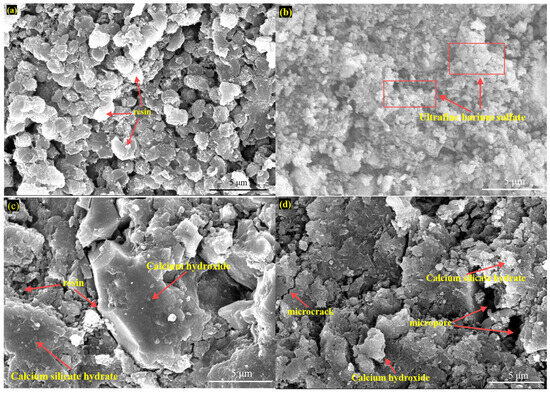 Figure 11a, Figure 11b, Figure 11c, and Figure 11d show SEM plots of uncorroded samples of TSR, FCR, RC, and PC, respectively. A large number of granular resin polymers can be clearly seen from the SEM images of TSR. These polymers exhibit tight arrangement and uniform particle size, constituting the main structure of the sample. They are intertwined with each other to form a strong and stable skeleton that provides good physical properties for the TSR resin-cured body. Compared with TSR, in addition to a large number of granular resin polymers, many ultrafine barium sulfate fillers with small particle sizes were also observed in FCR. These ultrafine fillers are interspersed and adhered to a large number of resin polymers, making the whole structure more compact and uniform. Ultrafine barium sulfate has a size of 3000 mesh, that is, a particle size of about four microns, and its tiny size allows it to better fill between resin polymers. The SEM image of RC shows the presence of hydrated calcium silicate gel matrix and plate calcium hydroxide crystals, which constitute the main part of the cement matrix. In addition, the granular resin polymers partially filled between the cement matrix can also be observed, which are tightly bound to the cement matrix and together constitute the overall structure of the sample. SEM images of PC uncorroded samples show that the uncorroded cement is mainly composed of hydrated calcium silicate gel matrix, plate calcium hydroxide crystals, and a small number of micropores and microcracks.
