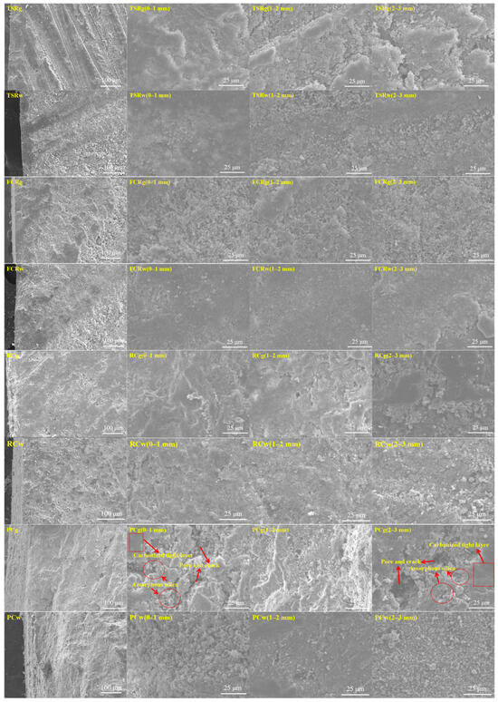 Core samples of TSR, FCR, RC, and PC after being corroded in the gas and water phase for 28 days were cut off from the cylindrical surface parallel to the corrosion direction, and relatively flat core blocks were selected for processing and polishing. The processed core blocks were dried overnight in a 60 °C oven, sprayed with gold, and placed into a scanning electron microscope to observe the microscopic morphology (Hitachi S-4700 (II) field emission scanning electron microscope produced by Hitachi, Tokyo, Japan). Then, perform EDS element scanning (Thermo NORAN energy spectrometer produced by American Thermoelectric Company, Chester, PA, USA). The scanning range is 0–1 mm, 1–2 mm, and 2–3 mm random points in the corrosion area. Three random points are selected. The final data are the average of 3 random points. Statistics on EDS element scanning are shown in Tables S2–S5 in the Supplementary Materials.