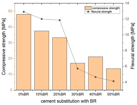 The mix design for the BR-based alkali-activated tile was developed by progressively increasing the substitution level of OPC with BR, ranging from 0% to 50% by weight, and examining the impact of this substitution on compressive and flexural strength, as shown in Figure 1. Supplementary cementitious materials (SCMs) tend to have a slower reaction rate compared to OPC [27]; therefore, the strength levels were measured after 28 days only. A gradual decrease in compressive strength was observed with increasing OPC replacement. The strength dropped from 48 MPa in the pure OPC sample to 38 MPa and 32 MPa when 10% and 20% of OPC were replaced with BR, respectively, and continued to decrease to 12 MPa with 50% replacement. This indicates that the strength activity index (SAI) of the blended mortar was lower than that of pure OPC, indicating a negative impact of BR on strength development. A similar effect was observed with flexural strength, although the trend was less pronounced when 10% and 20% of OPC were replaced.