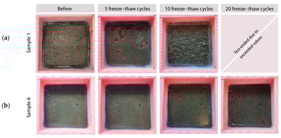 Freeze–thaw testing in the presence of de-icing salts for SS-based pavers: (a) pilot pavers before optimization showing surface scaling and (b) pilot pavers after optimization with significantly reduced scaling. Red dotted areas highlight spots of surface scaling.