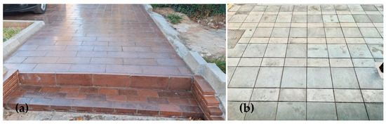 (a) The paved area of BR-based pavement blocks in Aspra Spitia, Greece; (b) the paved area of SS-based pavers at SIJ Acroni, Slovenia.