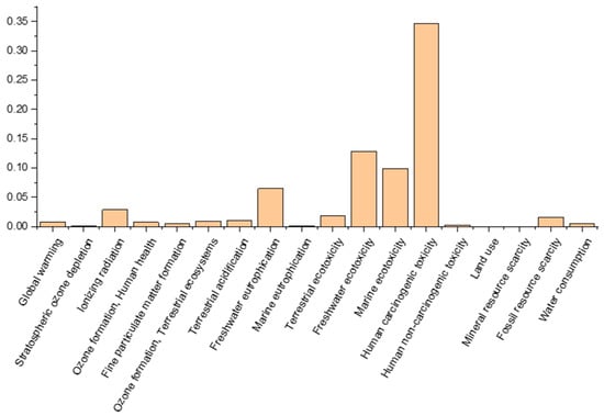 The cradle-to-gate scope includes raw material collection, manufacturing, and delivery but excludes usage and end-of-life stages. Background system data (e.g., grid energy and emissions) are separated from foreground data (e.g., data straight from the tile production). The final product was produced using the geopolymerization production process. Steps include slag collection, mixing, curing, and packaging. Figure 6 illustrates the impact that the production of one standard GEORIS tile has in the different environmental indexes.