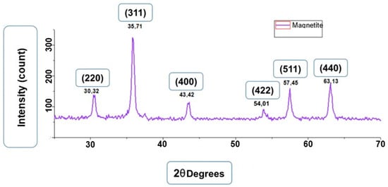 Figure 1 shows the diffractogram of the magnetite. In this figure, it was possible to identify the diffraction peaks at angle 2θ in 30.3°, 35.7°, 43.4°, 54.0°, 57.45°, and 63.1°. These peaks can be attributed to the Miller indices of (220), (311), (400), (422), (511), and (440), respectively.