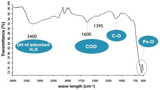 The (Rigaku Miniflix X-ray diffractometer, Akishima, Tokyo, Japan) was used to analyze the magnetite nanoparticles. The equipment’s radiation source is 40 KV voltage and 20 mA current. The equipment’s target is a copper plate, producing CuKα radiation with a wavelength of 0.154 nm. The scan was performed at a 2θ angle, ranging from 25 to 70° at a fixed time (FT), with a step of 0.05 °/min.