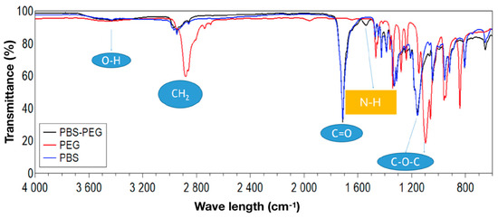 The peaks at 1711 cm−1 are related to the vibration of the C=O bond, which also comes from the ester group. Absorptions present around 3400 cm−1, corresponding to the stretching of the –OH bond. The 1539 cm−1 peak belongs to the NH bond present in the urethane bonds, which appears only in the PBS-PEG copolymer (Figure 4), indicating that the connection between the PBS and PEG polymers using TDI was successful, as well as the presence of the signed bands, which is a strong indication of obtaining the copolymer.
