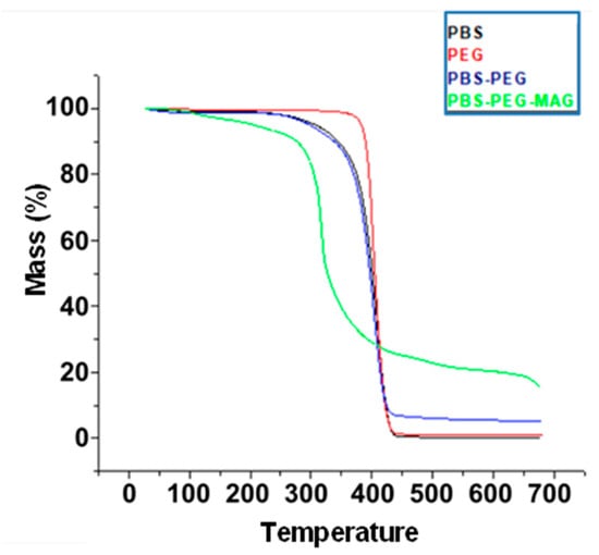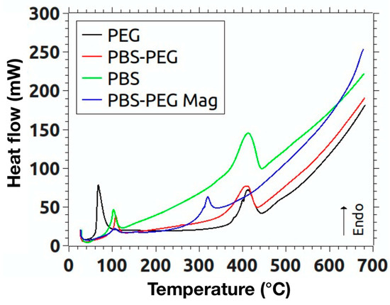 DSC analyses of the polymers: PBS, PEG, PBS-PEG, and encapsulated magnetite nanoparticles were also performed (Figure 8). In this graph, we have the melting endotherms of the polymers and the encapsulated magnetite. It is clear that the first peaks refer to a phase change of the samples due to the absence of mass loss in the TGA curves in the temperature range in which the peaks occur. The PBS has a melting peak at 102.6 °C, while in the PEG the peak is located at 67.5 °C. The melting peak of PBS-PEG is at 107 °C and that of encapsulated magnetite at 105 °C. From the graph, it is also possible to obtain the enthalpy value of the phase change of each polymer and of the encapsulated magnetite. PBS presented a ΔHf value of 59.8 J/g, corresponding to the energy required for polymer fusion, while, in the PEG, the ΔHf value was 148 J/g and, in the PBS-PEG, it was 58.7 J/g. In turn, composite has ΔHf = 36.7 J/g. The second endothermic peak represents the degradation of polymers and encapsulated magnetite. In PBS, the second endothermic peak was observed at 412.5 °C with a ΔH value of 280.2 J/g. In PEG, the peak was observed at 410.7 °C with a ΔH value of 147.8 J/g. PBS-PEG has the second peak at 407 °C and a ΔH value of 262.2 J/g, while the encapsulated magnetite presented the second peak at 319.5 °C with a ΔH value of 57.2 J/g. We can see that PBS-PEG showed the first endothermic peak with a temperature higher than PEG and PBS, probably due to the fact that PBS crystals are surrounded by PEG chains, increasing the thermal gradient. So, we can see an increase in the melting temperature, but we do not see an increase in the enthalpy of PBS-PEG compared to PBS. The encapsulated magnetite curve showed a different profile from other polymers, with lower enthalpy values and lower degradation temperature, which corroborates the idea of some catalytic effect generated by nanoparticles.