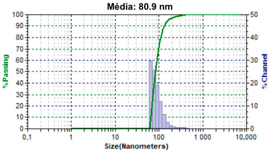 In the DLS analysis, we can observe the size distribution of the magnetite nanoparticles (Figure 9). An average size of 80.9 nm of the magnetite nanoparticles was obtained; probabilistic aggregates of about 91 magnetite nanoparticles since the analysis of XRD allowed the calculation of a size of 18 nm for the nanoparticles. The graph also shows that the filtering of particles using a 200 nm pore filter was efficient, as the percentage of particles with sizes greater than 200 nm was insignificant.