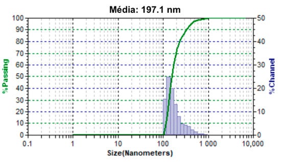 Another DLS analysis was performed with the magnetite nanoparticles encapsulated with PBS-PEG. We can see, in Figure 10, the size distribution of the nanoparticles, where the average size was 197.1 nm and 70% of the nanoparticles are concentrated in the 100–200 nm range. This is a good feature for particles that will circulate in the bloodstream. These particles, when administered intravenously, may preferentially accumulate in tumors. This accumulation is due to the permeability and retention effects. Particles with a size of around 200 nm passively enter tumor blood vessels [19]. Circulating macrophages and reticuloendothelial cells residing in the spleen and liver recognize these particles as foreign and surround and eliminate them from the circulation. However, particles sized at 200 nm can escape detection by the immune system, resulting in prolonged circulation times for these nanoparticles. This increases the circulation time of these nanoparticles [20]. Another important fact that we can observe is that we do not have particles larger than 1000 nm, which makes this formulation able to be administered intravenously without risks to the user since the diameter of the smallest capillary vessels is around 5 to 6 μm, and so that embolism does not occur, the administered particles must be significantly smaller [21]. Through this analysis, we can make another important observation: after the magnetite nanoparticles were encapsulated, we did not observe particle sizes smaller than 100 nm. Where the largest portion of magnetite nanoparticles aggregates were found, the size distribution graph shifted, causing most of the particles to be in the range of 100–200 nm, which shows an increase in size generated by the PBS-PEG layer around the nanoparticles of magnetite. This increase in particle size due to the formation of polymer layers on the particle surface was also observed in the work [22].