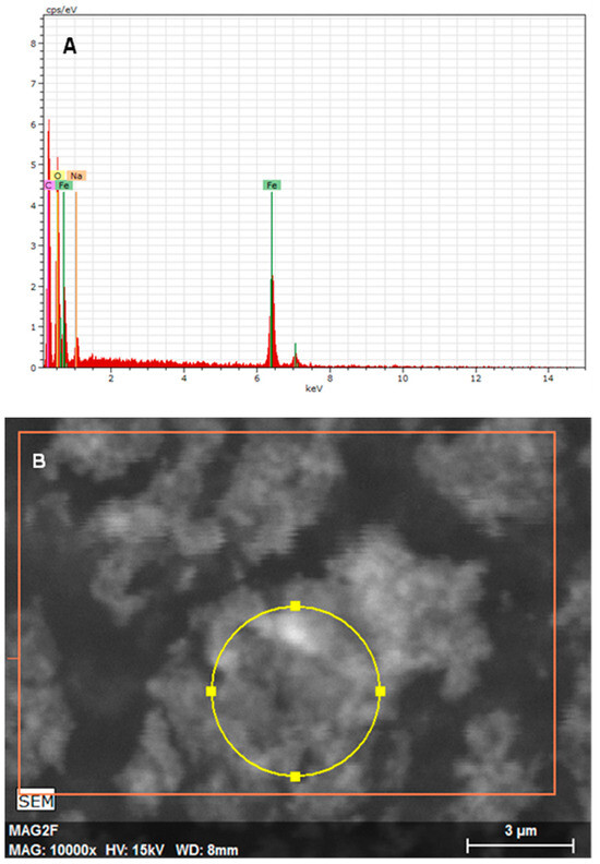 (A) Image obtained, in the SEM, of the region analyzed by the EDS, (B) graph of the EDS spectroscopy of the encapsulated magnetite nanoparticles.