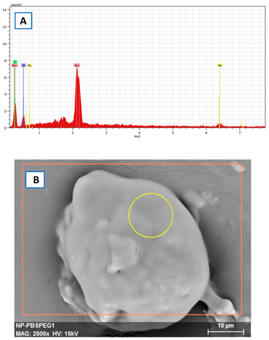 In the analysis of the EDS, we can see, in Figure 13, that the analyzed region marked with a yellow circle in image B has peaks in the regions of carbon (C) and oxygen (O), which are elements present in PBS-PEG. We can also observe a smaller peak and more extension of iron (Fe) compared to EDS performed with free magnetite nanoparticles; this is due to the fact that the magnetite is covered with PBS-PEG, which makes the presence of Fe less noticeable for the equipment. The gold peak (Au) appears on the graph because the sample was covered with gold to improve the resolution of the images.