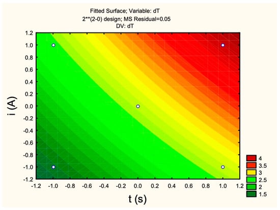 Figure 14 shows the effect of current and time on the temperature, where it is clear that, when we increase the current or time, we have an increase in temperature.