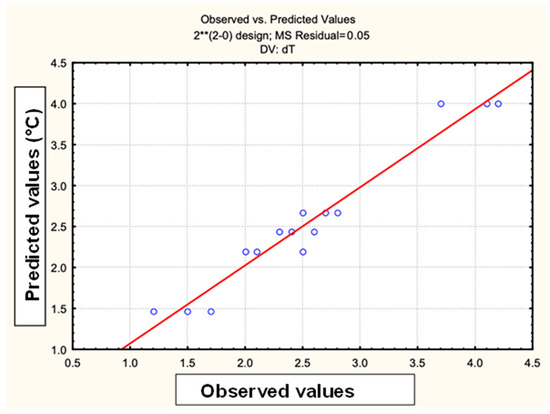Figure 15 has a graph of predicted values versus observed values. Based on the results obtained, the STATISTICA program proposes a model predicting what the temperature value will be for each point of the experiment, which is represented by the red line and the values obtained by the blue circles.