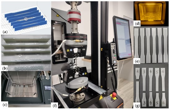 Fabrication of tensile samples and their uniaxial tensile tests: (a) Layout of the samples in the printing software; (b) Samples on the printing table; (c) Post-processing by washing with isopropyl alcohol; (d) Post-processing by treatment with ultraviolet radiation; (e) Printed samples; (f) The uniaxial testing configuration of the specimens; (g) Specimens after tensile tests.