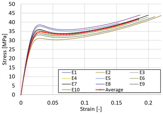 The red curve represented in Figure 4 shows the average (mean) true stress–strain curve for the 10 uniaxial tensile tests carried out. An initial region of linear elastic behavior of the material is observed up to a strain of 2%. After yielding, a strain-softening tendency is identified, where the slope of the curve becomes negative, and a necking zone can be observed on the specimen. The third region corresponds to a long hardening region, specific to polymeric materials, with an almost linear evolution until the final rupture of the specimen.