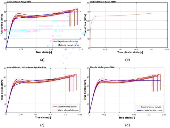 Considering the numerous material models available in FEA libraries used for numerical simulations and the complexity involved in defining them, it is beneficial to adopt simplifying approaches when working with more complex materials. Such a model is the power law non-linear isotropic hardening model, used in the case of materials that exhibit a non-linear hardening in the plasticity zone, defined by (4), where: σy—yield stress value, G—transversal modulus of elasticity, and N = 0.15 constant exponent as defined in [42]. In Figure 5c, the resulting model curve is plotted together with the experimental data.