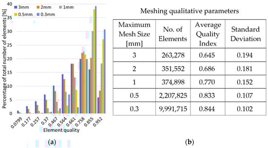 Initially, a convergence study was performed in order to analyze how the maximum size of the elements influence the final results. Figure 7a displays the percentage distribution of the number of elements of each mesh. Figure 7b shows the meshing qualitative parameters. It is observed that, contrary to expectations, there is no proportionality between the maximum size of the mesh and the number of elements into which the solid is discretized. This is due to the large elements generated in areas with large radii of curvature, which require a finer mesh in adjacent areas where the radius of curvature of the surfaces decreases. However, a positive trend in the average quality index and a negative trend in the standard deviation are observed as the refinement of the mesh increases. Also, the number of elements along the thickness of the geometry walls is important, noting that in the case of a mesh with an element size greater than 1 mm, a single element was generated throughout the thickness. This resulted in element shapes that significantly deviate from the ideal equilateral triangle shape typical of regular tetrahedron elements. As the mesh size is decreased, the walls are divided into more layers, which facilitates the creation of higher-quality elements along the surfaces.