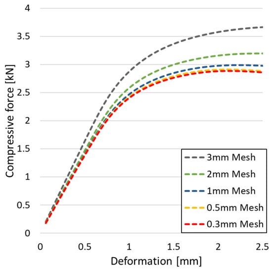 As the mesh refinement is increased, the value of the compressive force decreases significantly. If the model is composed of more elements, the value of the loading force is calculated more precisely. This is based on the increased ability to capture stress gradients more accurately across the part. There is, however, a point of diminishing improvement, where only computational time was added without a significant increase in model accuracy. For this reason, a mesh with a maximum size of 0.3 mm was adopted in order to provide a reasonable balance between convergence time and result accuracy. This mesh size was kept constant in all subsequent analyses.