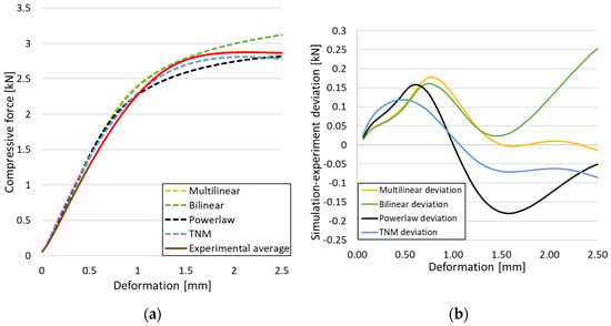 (a) Compressive force as a function of deformation for the proposed material models; (b) Difference between the dotted curves in (a) and the average experimental data (red curve).