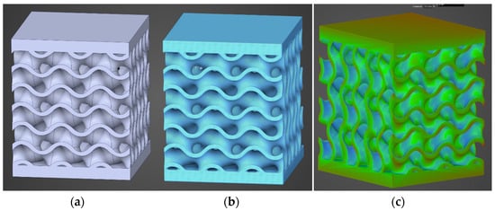 In the case of complex geometries such as topologies S2–S9 defined in [34], modeling by using a CAD approach becomes problematic. When the functions used are complicated, the transition from the explicit form of the defining function to the parametric equations , used by conventional design software, is difficult. In Figure 2, the procedure that resulted from implicit modeling used in this paper to generate a complex model integrated into numerical analyses is proposed.