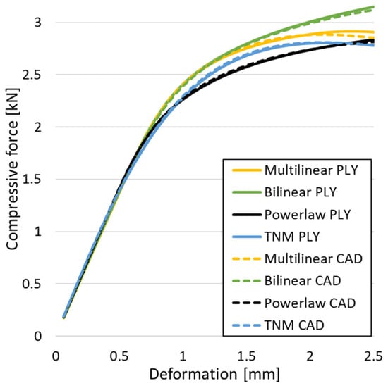 Figure 9a shows the compressive force as a function of the deformation for the numerical simulations (dotted lines) obtained for the gyroid sample with the material models described in Figure 5. It is observed that all of them give a response close to the average experimental curve obtained through compressive testing of three identical samples (red curve). All models present a similar stiffness deviation in the elastic region but follow different yield responses. In order to correctly estimate which of the four models came closest to the experimental data, the difference between the area under the curve of the numerical simulations for each model and the area under the curve of the average force recorded empirically was evaluated. Figure 9b highlights this deviation. Based on this plot, deviations of 2.54% for the Multilinear model, 4.65% for the Bilinear model, 5.08% for the Powerlaw model, and 3.16% for the TNM were determined.