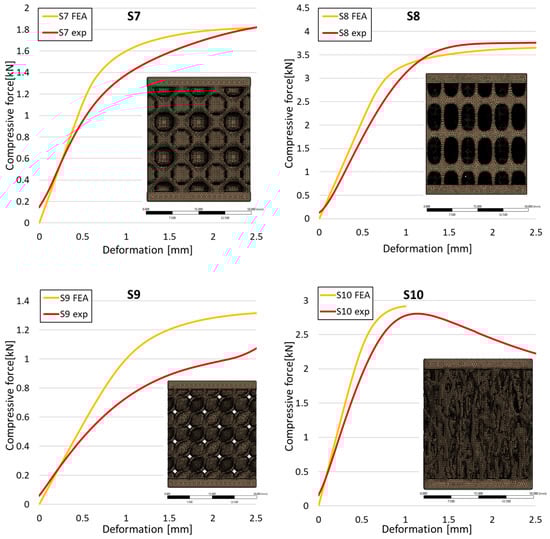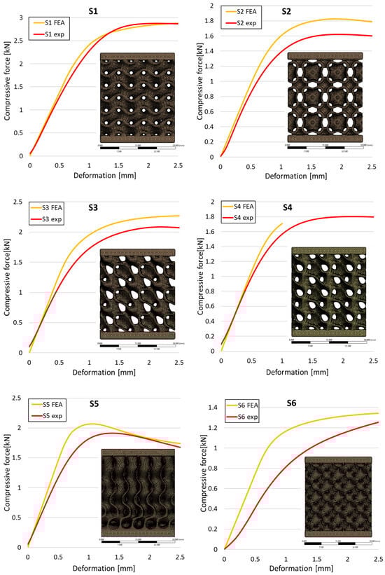 The analysis of the results obtained by numerical simulation in the Ansys Static Structural module is presented below. Figure 12 presents the meshed geometric model and a comparison between the average force–deformation curve obtained from three experimental tests performed on each proposed structure and the curves obtained from FEA. An approach similar to that presented in Figure 9b was used to identify the degree of overlap of the curves, obtaining the following relative deviations from the empirical data: S1—1.54%, S2—13.78%, S3—10.61%, S4—7.61%, S5—8.56%, S6—29.11%, S7—8.5%, S8—1.8%, S9—30.3%, S10—10.53%. It can be seen that all samples exhibited higher FEA stiffnesses in the elastic region, which can be attributed to differences between the longitudinal modulus of elasticity obtained from the tensile tests and its simulated value. A tendency of higher simulation error from the experimental results is observed as the yield strength of the samples decreases. If geometries S1 and S8 present the highest compressive forces and the lowest deviations, at the opposite side are samples S6 and S9 with the lowest accuracies and the lowest capable forces. The high discrepancy indicated in the case of sample S6 can be attributed to the small features of the topology and the smaller wall thickness. This did not allow for three elements to be generated across the walls of the entire cell, thus reducing the accuracy of the results. In the case of specimen S9, the reason behind the high error could be its deformation mode. Due to its inclined layers, the structure does not show a bending-dominated behavior, such as for the other samples. An explicit analysis of this specimen could provide better results. At the same time, the discrepancies could also be related to alterations generated during the AM printing.