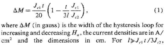 - When the magnetic moment is in [emu] and the dimensions in centimeters, their use in Equation (2) leads to Equation (4) where the current density is in the unpractical . In order to have the current density expressed in more practical units, the conversion can be used, which introduces a multiplicative dimensionless term 10 that transforms the number 2 into 20, and leads to a current density expressed in (Equation (5)). On the contrary, the expression where ΔM is stated to be in emu/cm3 and Jc is resulting in A/cm2 is misleading, because the dimensions on the right and left-hand side of the equation are not coherent and erroneously suggest the need for a further unit conversion.