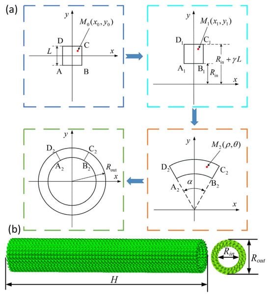 The geometric model of the Diamond LCS structure is obtained by the method proposed by Zhu in [], as shown in Figure 1a. Two coefficients, i.e., radial variation coefficient (), and mapping angle () are introduced to control the structural shape of the Diamond LCS. is defined as , is the outer diameter of the Diamond LCS, and is the inner diameter of the Diamond LCS. is defined as . The construction of the Diamond LCS structure is described as follows: (1) The unit cell of the Diamond is placed on the XOY plane; (2) The unit cell of the Diamond is transformed using , ; (3) The unit cell of the Diamond is transformed to the polar coordinate system using , ; (4) The complete Diamond LCS can be obtained by circumferentially arraying the sector-shaped cylindrical region.