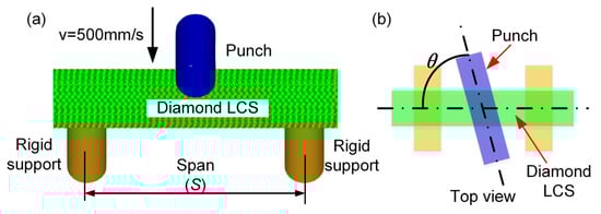 (a) FE model of Diamond LCS under three-point bending; (b) illustration of the loading angle.