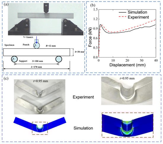 To verify the reliability of the proposed finite element modeling method, the experimental results of thin-walled square tubes under three-point bending are selected from reference []. The geometrical dimensions of the thin-walled square tube are shown in Figure 5a, and the square tube specimen is manufactured with aluminum alloy AA6063-O. The deformation process and force-displacement curves of thin-walled square tubes under three-point bending are simulated using the FE modeling method by LS-DYNA. The square tubes, punch, and supports are meshed by Belytschko-Tsay 4-node shell elements with five integration points, mesh size is used as 1.0 mm. Figure 5b and Figure 5c compare the deformation patterns and mechanical responses between the experimental and simulation results. It can be seen that the experimental results in the literature are quite consistent with the numerical results obtained by simulation.