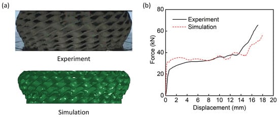 Verification of the numerical model []. Comparison of (a) the experimental and simulation deformation modes and (b) Experimental and simulation force-displacement curves.