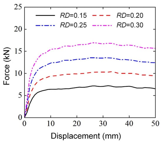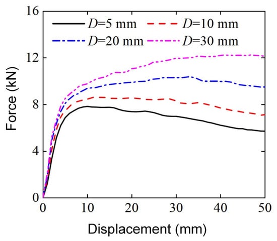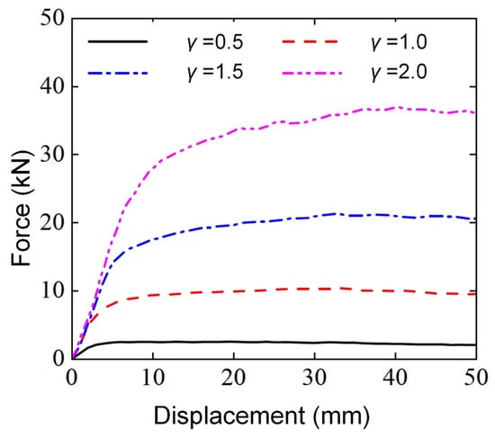 In previous studies on the three-point bending performance of thin-walled structures, it was found that the diameter of the punch also has an impact on the deformation mode of structures [,]. Therefore, four numerical models with different punch diameters () were established using the finite element method to study the influence of punch diameters on the lateral flexural properties of Diamond LCSs. All the Diamond LCSs used the same geometric dimensions and loading conditions: = 0.2, , , , and .
