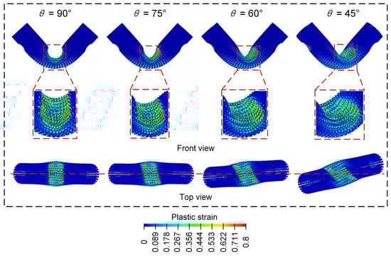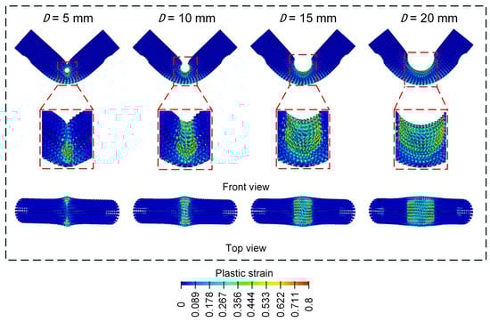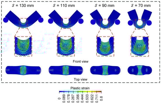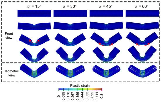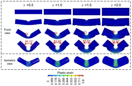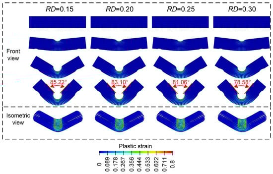From Figure 8, the final deformation modes of the Diamond lattice cylindrical shell structure under a three-point bending load all exhibit a similar “V” shape. With the increase in the contact surface between the punch and the Diamond LCS structure, the concave deformation zone near the cylindrical support is fixed and formed. Then the plastic strain on the inner side of the Diamond LCS structure and the plastic deformation on the outer side is more obvious, which indicates that more materials participate in the energy absorption process. This phenomenon makes the Diamond LCS structure have higher energy absorption efficiency. With the increase in , the “V” angle of the structure decreases gradually. Nevertheless, the deformation of Diamond LCS with different is almost unchanged.