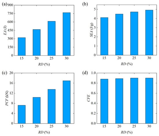 Finally, the bending energy absorption characteristics of Diamond LCS structures with different are further compared in Figure 9. The and of Diamond LCS increased linearly with the increase in . That is, the larger the RD, the better the energy absorption of Diamond LCS. As shown in Figure 9c,d, of the Diamond with different has a similar change rule to , and it also increases monotonically with the increase in the . Although the larger the RD, the larger the . The of Diamond LCS was not sensitive to , and the of all configurations remained at a relatively stable level (about 0.89). In short, the larger the , the better the lateral bending performance of Diamond LCS.