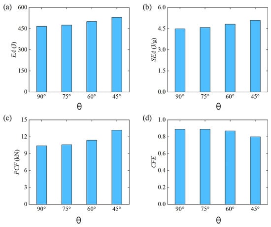 Figure 18 further shows the comparison of energy absorption characteristics of Diamond LCS under different loading angles. The results show that the energy absorption capacity and efficiency of Diamond LCS increase with the decrease in loading angle. When the punch is loaded downward perpendicular to the structural axis, the energy absorption effect of this configuration is the worst. As shown in Figure 18c, the of the Diamond LCS also increases with the decrease in the loading angle. At the same time, the impact force efficiency decreases monotonously with an increase in the loading angle, while the CFE is maintained at a relatively high level.