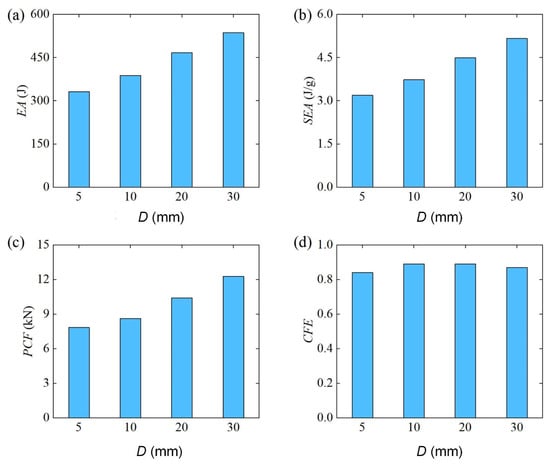 Figure 21 further shows the comparison results of energy absorption characteristics of Diamond LCS under different punch diameters. The results show that , and of Diamond LCS increase monotonously with the increase in punch diameter. At the same time, its impact force efficiency has no obvious change after the punch diameter and generally maintains a high level.