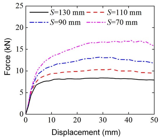 Figure 22 shows the bending load force-displacement curves of Diamond LCSs at different spans. All Diamond LCSs exhibit load characteristics with similar evolution trends, that is, the force goes through a platform stage with a long displacement after the elastic deformation stage until the end of deformation. The elastic peak value and platform force of Diamond LCS increase with the decrease in span. Combined with the final deformation pattern diagram in Figure 23, it can be found that with the decrease in span, the curvature of bending deformation of the Diamond LCS structure increases. At the same time, the effective plastic deformation area inside and outside the Diamond LCS indentation increases, and more materials are involved in energy absorption.