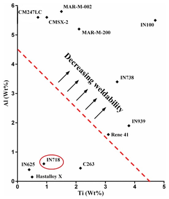 “Weldability” diagram for a range of Ni alloys as a function of their Ti and Al content. Weldability is considered poor above the dashed line and deteriorates with increasing Ti and Al content. Reproduced from Catchpole-Smith et al. [11].