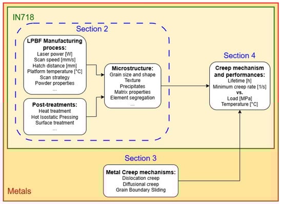 Therefore, this review paper aims to understand and summarize the creep mechanisms of IN718 processed by LPBF to address the existing knowledge gaps on this topic. A secondary objective of this study is to correlate final properties to microstructure with the purpose of showing whether the mechanical performances of IN718 components at high temperatures can be improved through optimized post-treatments. To reach these objectives, a sequential order should be followed. Indeed, as schematically presented in Figure 2, the creep performances of a sample depend on the mechanisms that take place at the microscopic scale within the material. They depend on the microstructure and test conditions, i.e., loading and temperature. The formation of the microstructure, starting with the LPBF manufacturing process and potentially followed by post-treatments, is crucial for understanding the underlying creep mechanisms.