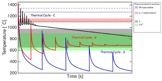 Schematic representation of the different thermal cycles in the Laser-Directed Energy Deposition (L-DED) process starting at final solidification. In Thermal Cycle–A, enough time is left between layers to avoid heat accumulation, in Thermal Cycle–B and –C, insufficient idle time is left, inducing heat accumulation. Dotted line defines the Solidus, dashed line defines the Liquidus. Reproduced from [2].