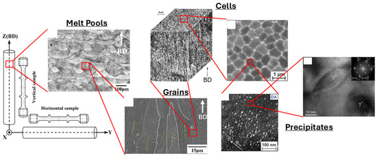 Due to those unusual manufacturing conditions, AB samples display what is referred to as a hierarchical microstructure with distinct features at different scales, as shown in Figure 4 [51]. First, one can observe Melt Pools of approximately 100 µm width and then elongated grains covering several MPs at the same scale [23,50]. At the microscale, dendritic/cellular substructures appear due to rapid solidification, and, at the nanoscale, strengthening precipitates are observed within the cells [68].