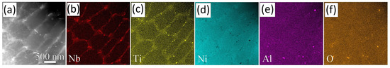 (a) High-Angle Annular Dark-Field Imaging in a Scanning Transmission Electron Microscopy (HAADF-STEM) micrograph of AB IN718 and (b–f) corresponding Scanning Transmission Electron Microscopy–Energy Dispersive X-ray (STEM-EDX) maps highlighting segregated elements at cell boundaries. Partial figure reproduced from [60].