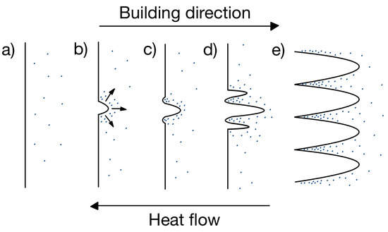 Schematic representation of cellular growth: (a) initial planar interface, (b) formation of a first protrusion, (c) formation of recesses, (d) formation of other protrusions, and (e) formation of cells. Blue dots are segregating elements. Inspired by [68,85].