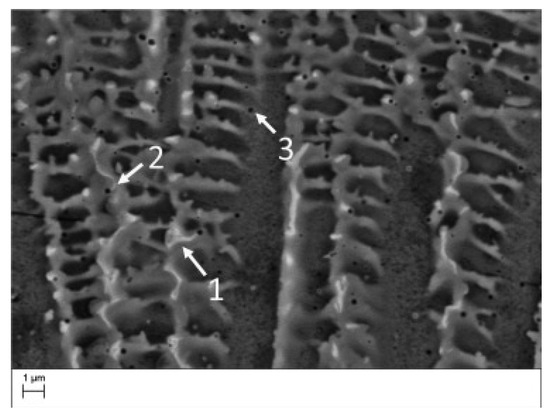Interdendritic microsegregation inside γ-phase grains; the arrows indicate the following: 1—colonies of eutectic mixture ( + Laves type phase); 2—divorced eutectics; 3—MC carbides (black). BSD/SEM. Reproduced from [86].