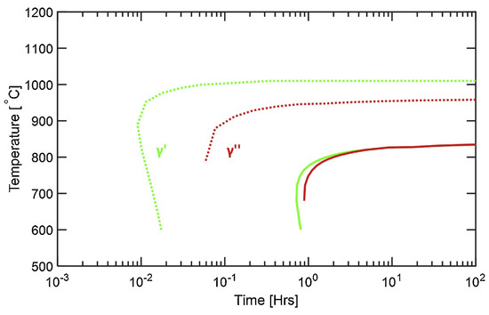 At the subcellular scale, one can mostly observe and strengthening precipitates in addition to small-sized carbides. tend to precipitate as <200> textured columnar stacks with precipitates measuring 100 nm along their major axis and 25 nm along their minor axis, according to Amato et al. [20]. Spherical Nb carbides form in Nb-enriched areas, i.e., in the interdendritic regions [86]. In the AB condition, precipitation of and is, however, not very substantial: the formation of those phases relies on solid-state phase transformations (see Figure 3 for precipitation windows) but rapid solidification does not allow for extensive precipitation, relying on diffusion, as represented in the Continuous Cooling Transformation (CCT) diagram in Figure 10. Note that an ideal size of ~23 nm for precipitates was experimentally set by Chaturvedi [13] in order to reach the highest level of strengthening in creep without forming incoherent interfaces. Due to Nb and Ti segregation, a gradient of precipitate density is observed between the cell boundary and the cell core, leading to a corresponding gradient in mechanical properties [2]. Solution or homogenization heat treatments are often recommended to solve the problem of insufficient precipitation of strengthening phases due to the inhomogeneous distribution of Nb and Ti.