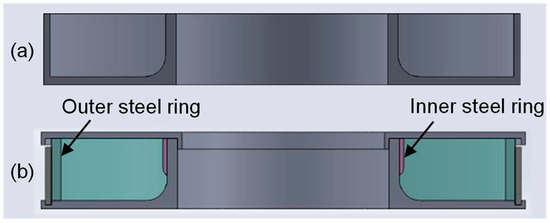 Schematic of the molds fabricated by fused filament fabrication for (a) reference die made of UHPC and (b) die made of expansive UHPC in a restrained condition with outer and inner steel ring and cover.